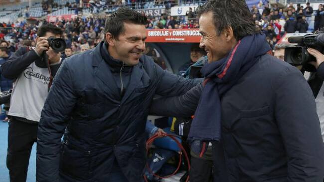 El entrenador del Barcelona, Luis Enrique Martínez (d), saluda al del Getafe, Cosmin Contra (i), al inicio del partido de la jornada décimoquinta de la Liga de Primera División, que se juega hoy en el Coliseum Alfonso Pérez / Juan Carlos Hidalgo (EFE)