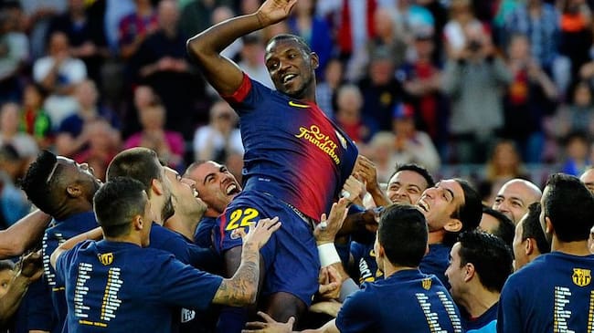 El francés, con sus compañeros tras jugar su último partido con el Barcelona en 2013.