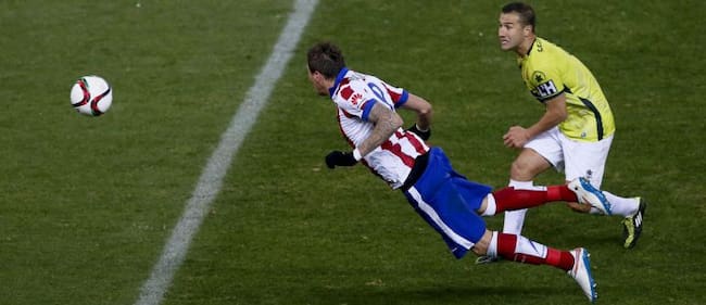 El Atlético se adelantó pronto. A un par de amagos sobre la portería contraria, les siguió el 1-0 en el minuto 17, en una acción culminada por el croata Mario Mandzukic, que recogió un rechace dentro del área y batió por bajo a Craviotto para ampliar la ventaja en la eliminatoria con una resolución de goleador por raso.