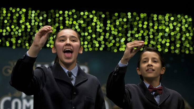 Los niños de San Ildefonso Ismael Rastrelli Mekerbech (d) y Janna Flores Villavicencio (i), han cantado el premio Gordo: 13.437. / EFE / ATLAS