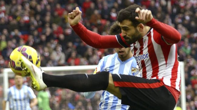 El defensa del Athletic Club Mikel Balenziaga despeja un balón ante un rival del Málaga en el partido de la vigésima jornada de liga en Primera División que se disputa esta tarde en el estadio de San Mamés. / Miguel Toña (EFE)