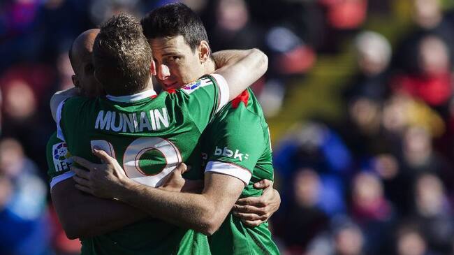 Los jugadores del Athletic de Bilbao Mikel Rico y Muniaín, felicitan a su compañero Aritz Aduriz tras marcar ante el Levante / MIGUEL ÁNGEL POLO (EFE)