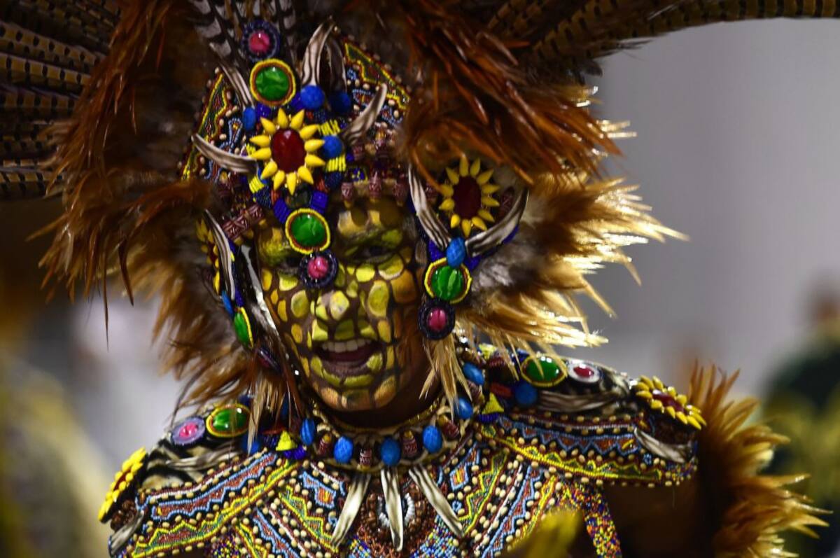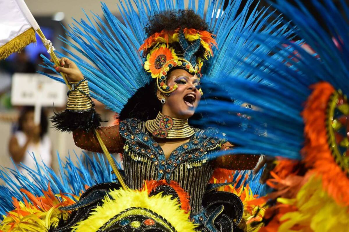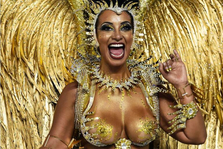 Una integrante de la escuela de samba del Grupo Especial Tom Maior desfila durante la celebración del carnaval en el sambódromo de Anhembí, en Sao Paulo.