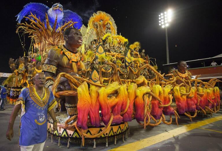 Miembros de la escuela de samba Tom Maior, durante su actuación en la primera noche del Carnaval en Brasil.