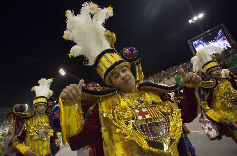 Integrantes de la escuela de samba Mancha Verde, un grupo que rinde tributo al equipo de fútbol Palmeiras, desfilan con símbolos del FC Barcelona.