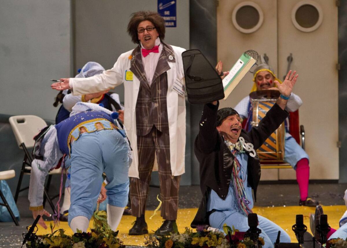 La chirigota "El que entra no sale", durante su actuación en la final del Concurso de Agrupaciones Carnavalescas que se celebra en Cádiz.