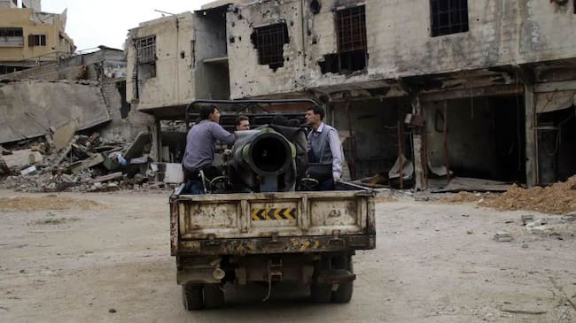 Rebel fighters from the Free Syrian Army's Al Rahman legion prepare a locally made weapon before firing towards forces loyal to Syria's President Bashar al-Assad on the frontline, in the eastern Damascus suburb of Ghouta March 12, 2015. REUTERS/Diaa Al-D / DIAA AL-DIN (Reuters)