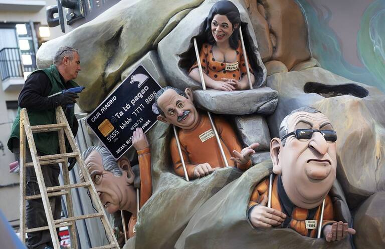 Un artista fallero retoca una de las obras en la que aparecen Miguel Blesa, Alberto Fabra, Isabel Pantoja y el exalcalde de Marbella, Julián Muñoz.