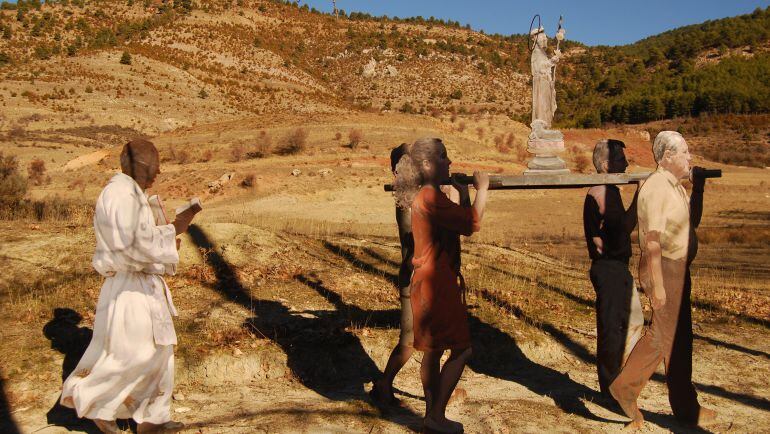 En la Serranía de Cuenca, en Valdemeca, un pueblo de menos de cien habitantes, el artista local Luis Zafrilla ha creado un recorrido a base de esculturas metálicas y después pintadas, en el que recoge escenas de la vida rural “en peligro de extinción” como los juegos infantiles de antaño, el trabajo en la era o el acarreo de productos del campo con el burro del ramal. ‘El paisaje ilustrado’ se llama el paseo escultórico, e incluye la escena de una procesión, con el cura y los vecinos portando en andas una imagen. Pues bien, esta estampa está desapareciendo también de los pueblos más pequeños. En Ribatajada, un pueblo de poco más de cien habitantes de la comarca del Campichuelo conquense, hace dos años que no salen las procesiones en Semana Santa. “Tengo cuatro hijos y no hay ninguno en el pueblo”, nos cuenta Trinidad, de 75 años. “Igual que mis hijos, muchos se fueron a estudiar y ya no han vuelto”. Y aunque sí vuelven algunos estos días de Semana Santa, “no se acercan a la iglesia”. “La gente mayor ya no puede y la gente joven no va a misa”, dice Trinidad.