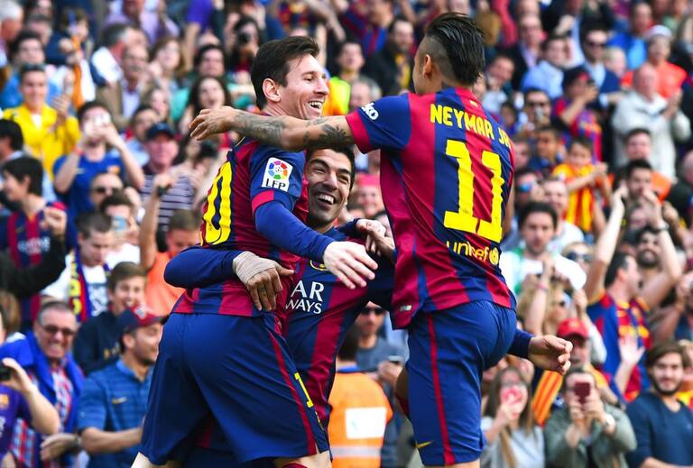 Messi y Neymar se abrazan a Luis Suárez, primer goleador del partido