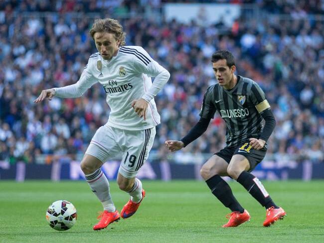 Luka Modric se lleva el balón ante Juanmi, el delantero del Málaga