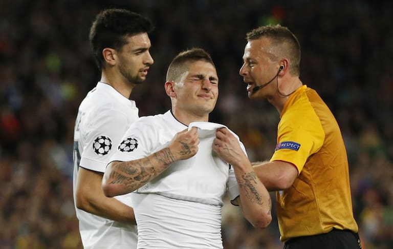 Gesto de contrariedad de Marco Verratti en el partido del Camp Nou.