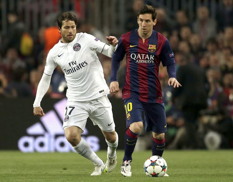 Messi, defendido por Maxwell en una de las primeras acciones del choque.