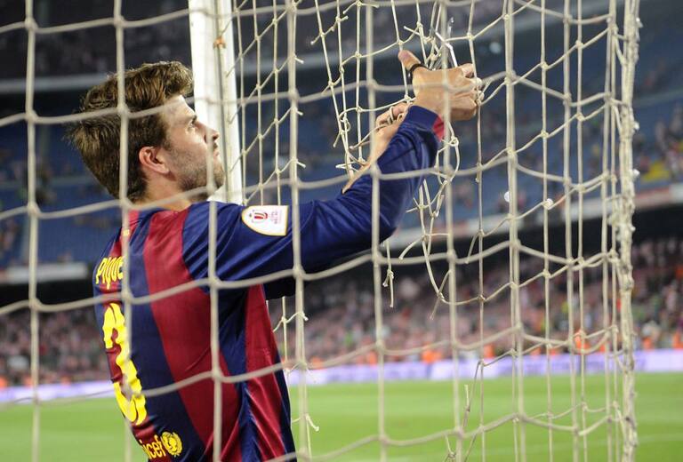 El defensa Gerard Piqué cortando un trozo de la red