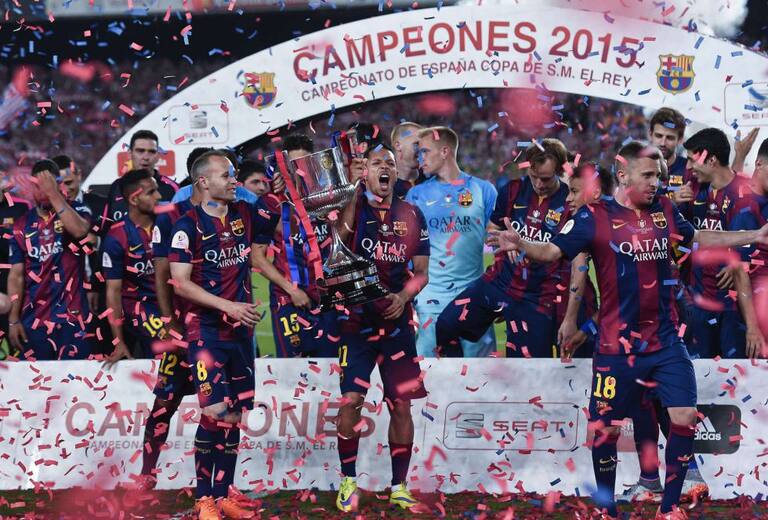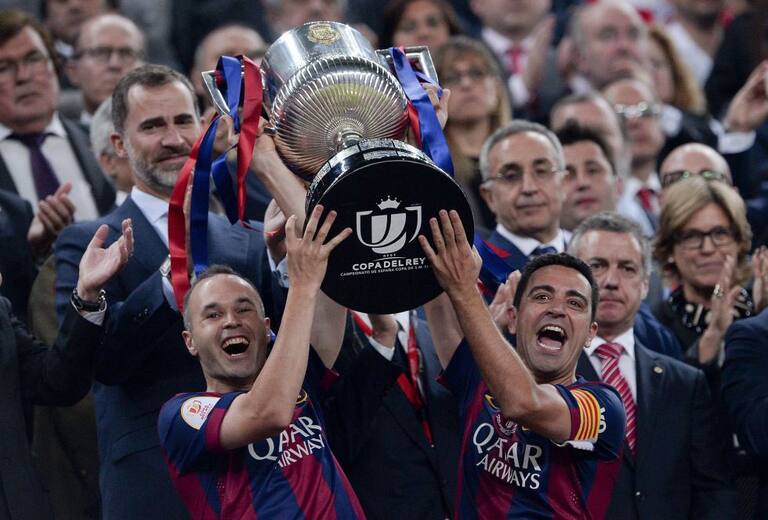 Xavi e Iniesta levantando la Copa del Rey tras la final