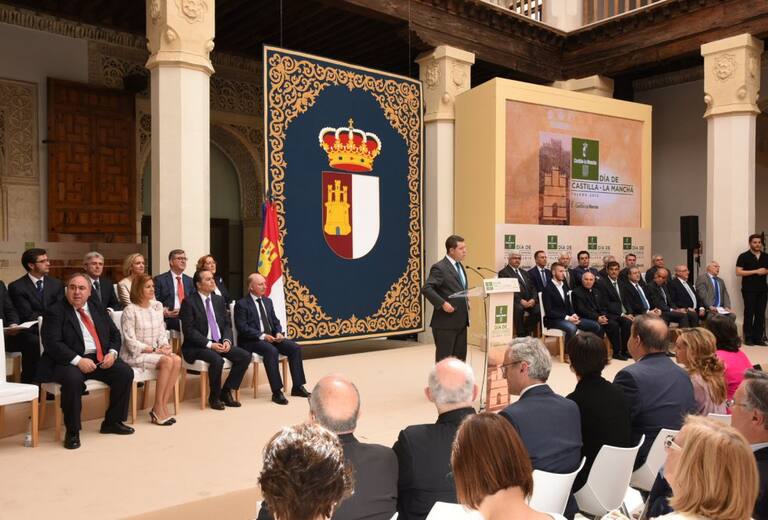 Asístentes al acto escuchan la intervención de Emiliano García Page que saluda a los miembros de la presidencia