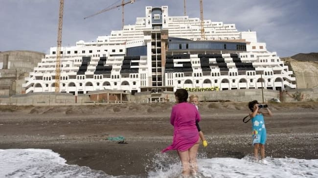 1) La playa del Algarrobico (Carboneras, Almería). Este tramo del litoral de inigualable belleza, tiene a sus espaldas una mole de hormigón de 21 plantas, que tenía la intención de convertirse en un hotel en primera línea costera. Y todo ello a pesar de que, por sentencia no recurrible, las primeras 14 plantas del hotel han sido declaradas ilegales por el Tribunal Supremo.