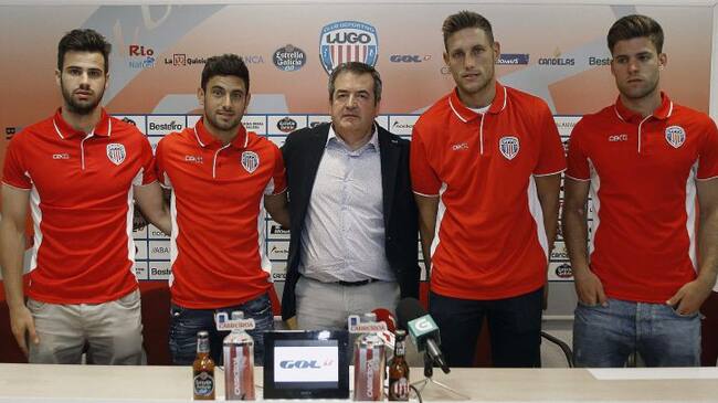 El presidente del Lugo, Tino Saques (c), durante la presentación de los cuatro nuevos jugadores del club, Antonio Campillo (i), Igor Martínez (2i), Carlos Hernández y Mario Barco (d), en el estadio Anxo Carro. / Eliseo Trigo (EFE)