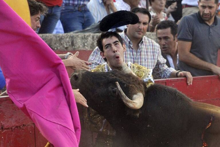 Fotografía facilitada por 'La Gaceta de Salamanca' de la cornada en el cuello el diestro malagueño Saúl Jiménez Fortes cuando lidiaba al primero de su lote en la corrida de toros de esta tarde en la localidad salmantina de Vitigudino.