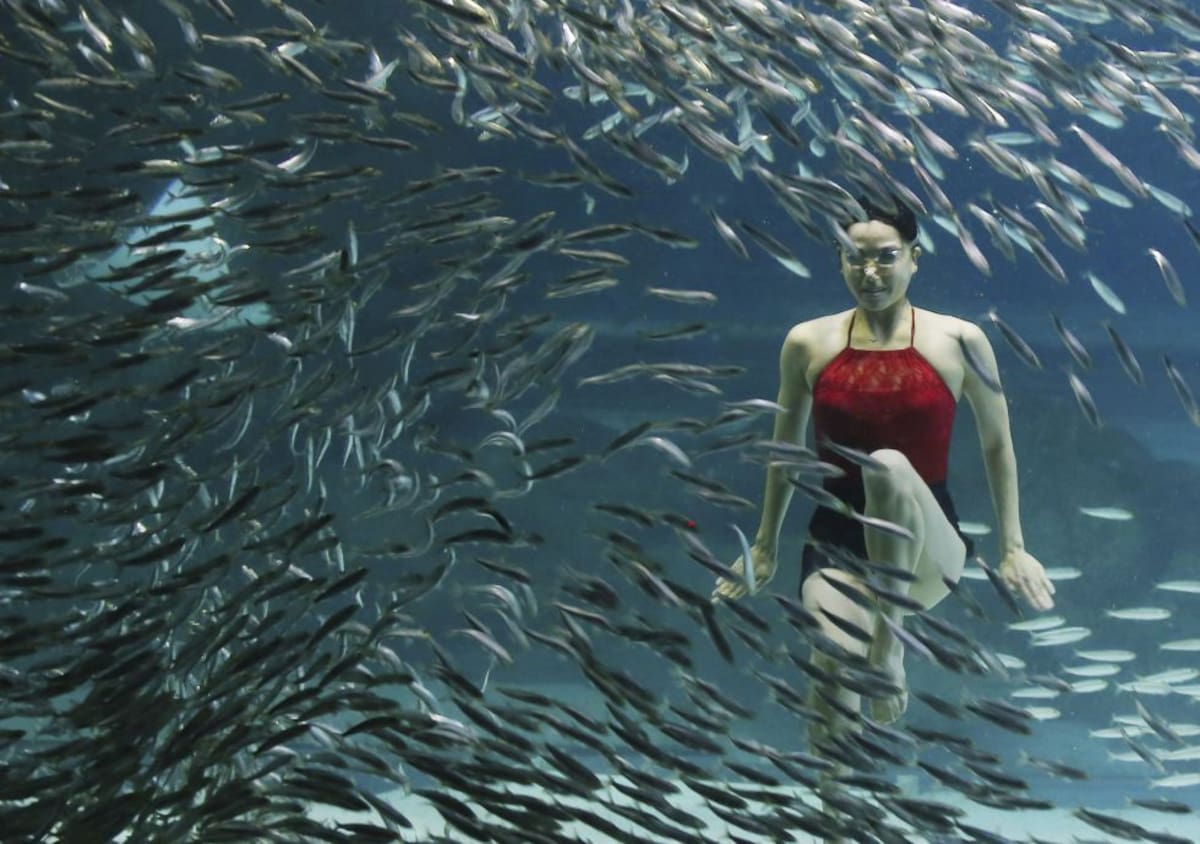 Una nadadora de natación sincronizada nada con sardinas durante un espectáculo en el acuario de Seúl (Corea del Sur) hoy 18 de agosto de 2015.