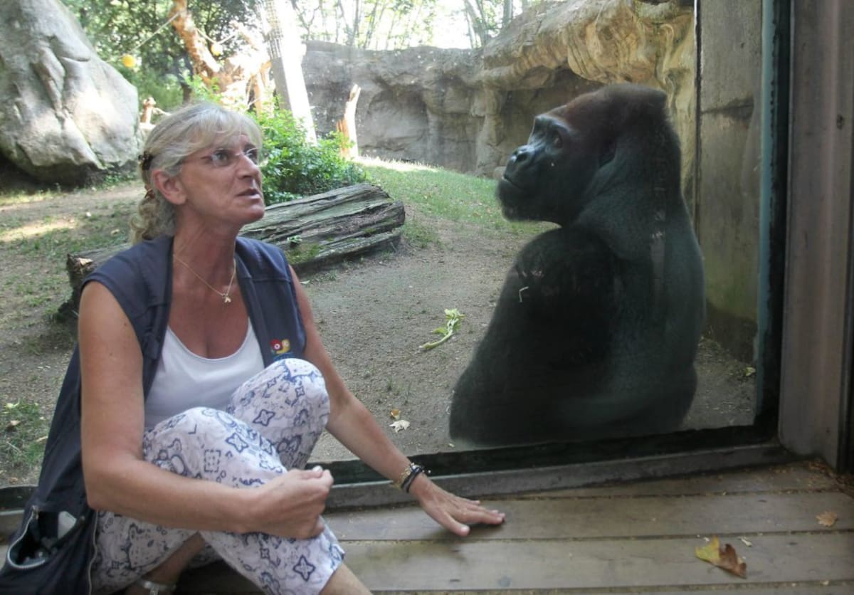 La bióloga y conservadora de primates del Zoo de Barcelona María Teresa Abelló imita el gesto del gorila en las instalaciones del Zoo de Barcelona.
