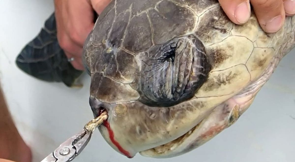 Dos biólogos intentan sacar una pajilla de plástico de la fosa nasal de una tortuga en San José (Costa Rica). El sufrimiento de la tortuga supone una alerta sobre la necesidad de reducir el uso del plástico, material del que cerca de ocho millones de tone