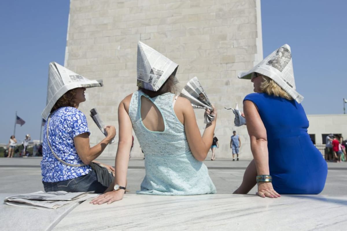 Visitantes usando gorros de papel para protegerse en un día caluroso y húmedo en Washington (Estados Unidos). La temperatura la capital estadounidense espera alcanzar los 35 grados.