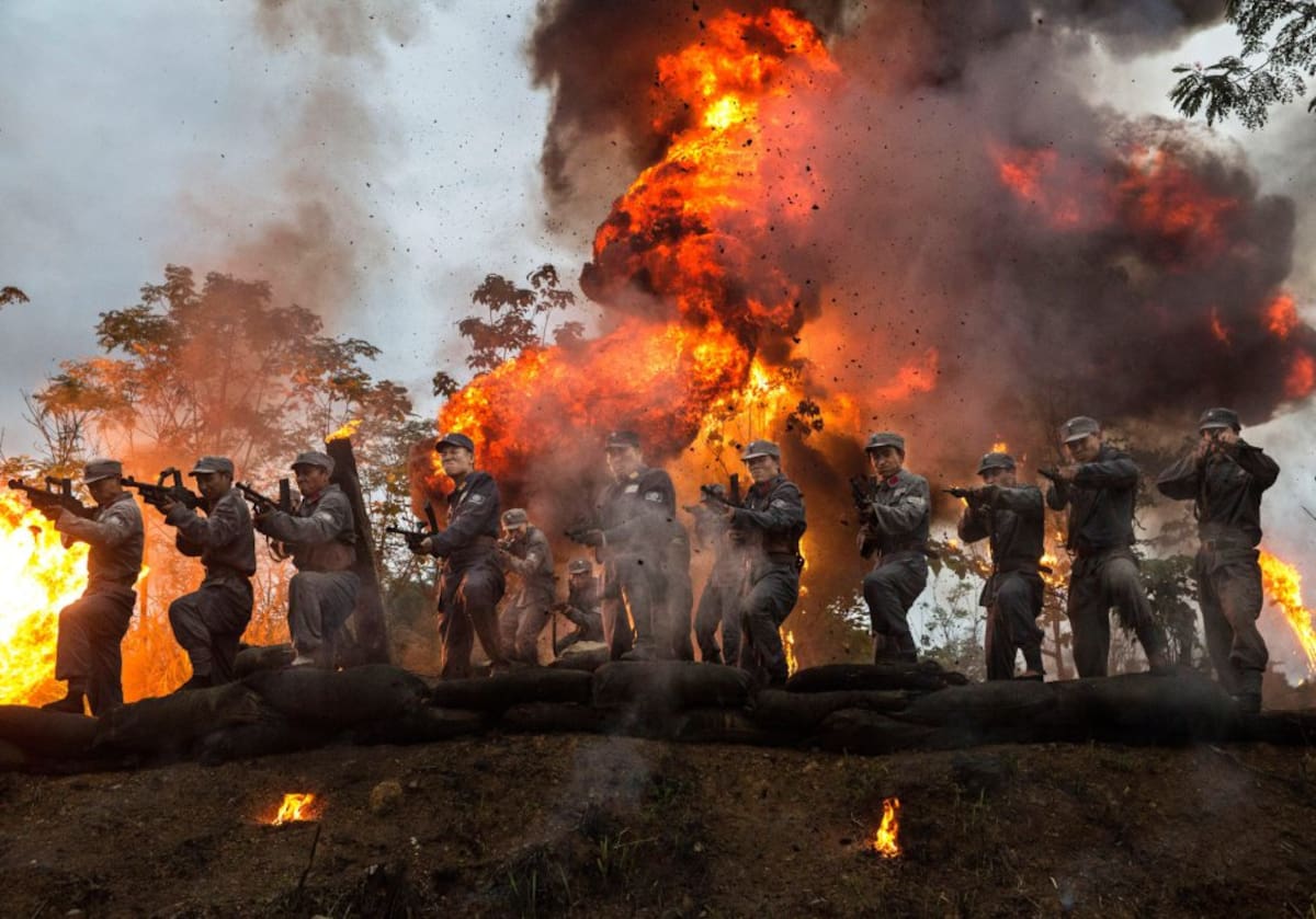 Enorme explosión lograda con efectos especiales durante el rodaje de una película de guerra china.