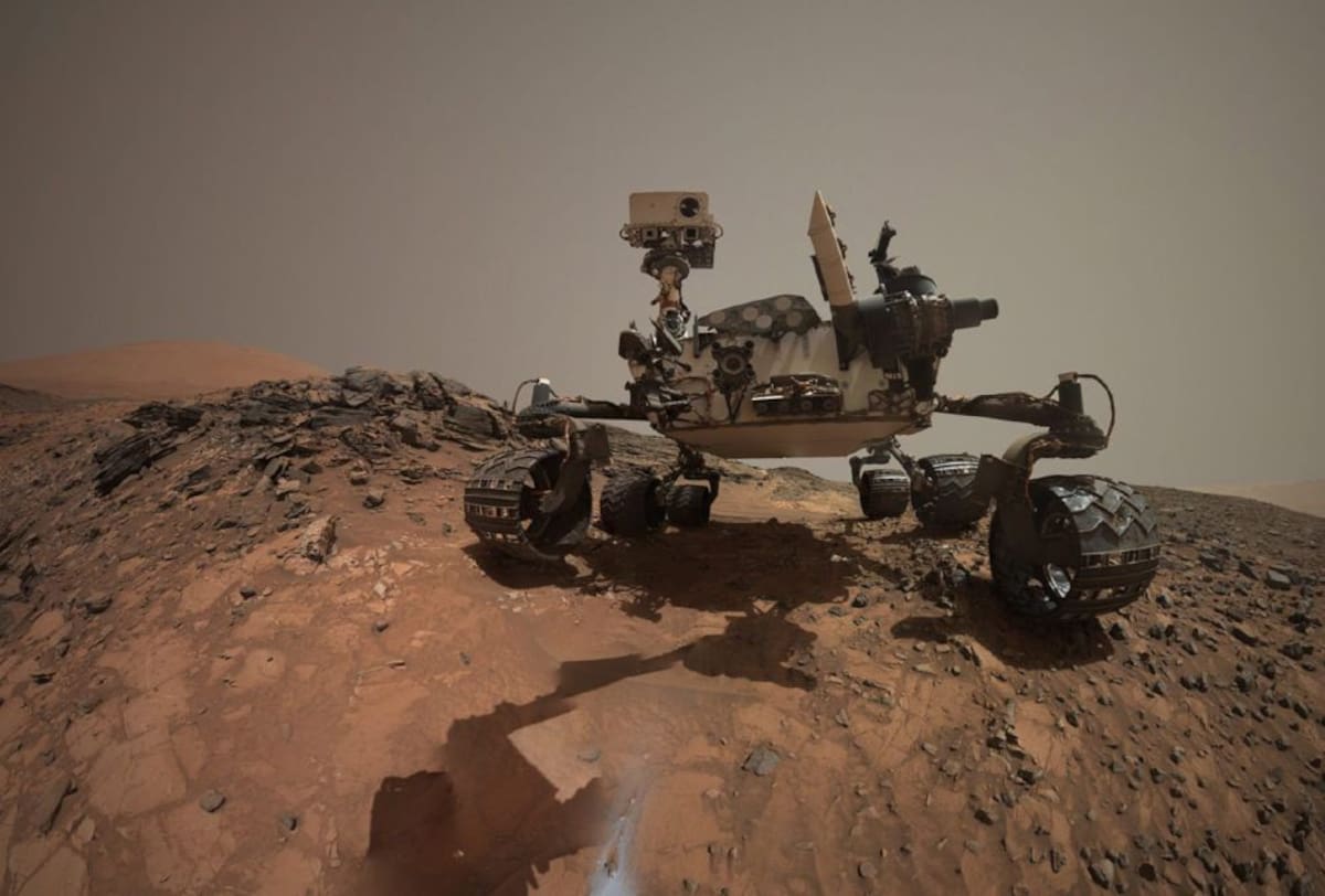 Fotografía cedida por la NASA que muestra una autorretrato del vehículo explorador de la NASA en Marte Curiosity sobre una roca 'Buckskin' en el área de 'Marias Pass' en la parte baja de Mount Sharp en Marte, donde el vehículo realiza la misión de recoger