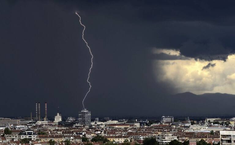Un rayo ilumina el cielo sobre los edificios durante una tormenta en Sofía, Bulgaria, hoy, 17 de agosto de 2015.