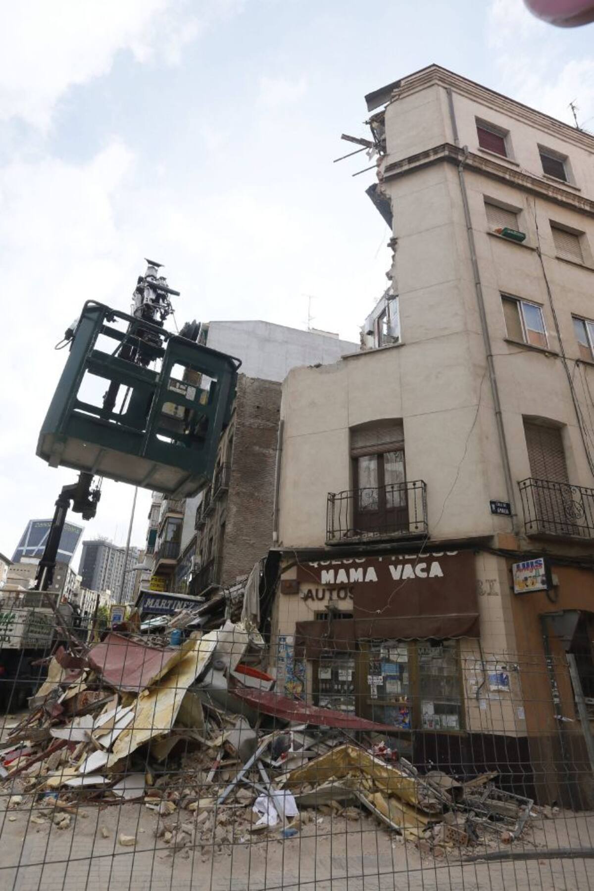 Una grúa junto al edificio semiderruido situado en la confluencia de las calles Bravo Murillo y Amalia, en el distrito de Tetuán de Madrid. La eliminación de un pilar que sostenía el peso de la fachada es la posible causa del derrumbe del inmueble que aye