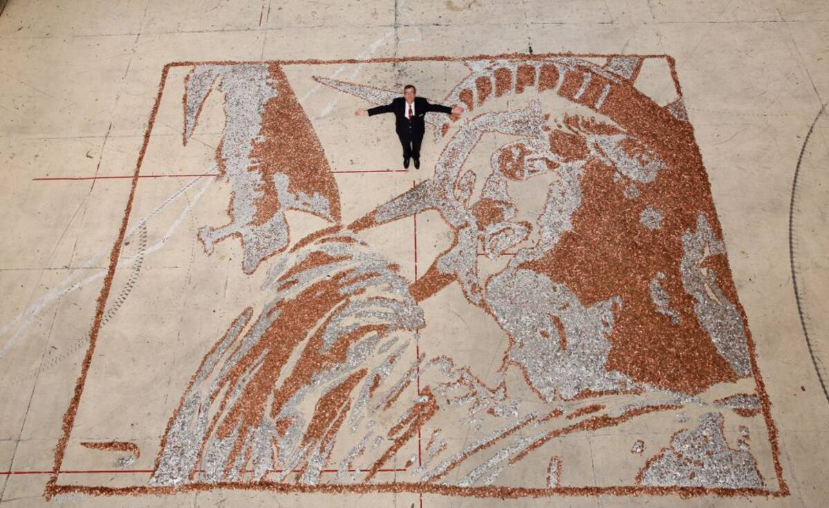 La estaua de la Libertad, dibujada con 600.000 monedas. Siete personas han tardadro seis horas en hacer esta obra de arte que mide 10x8 metros.