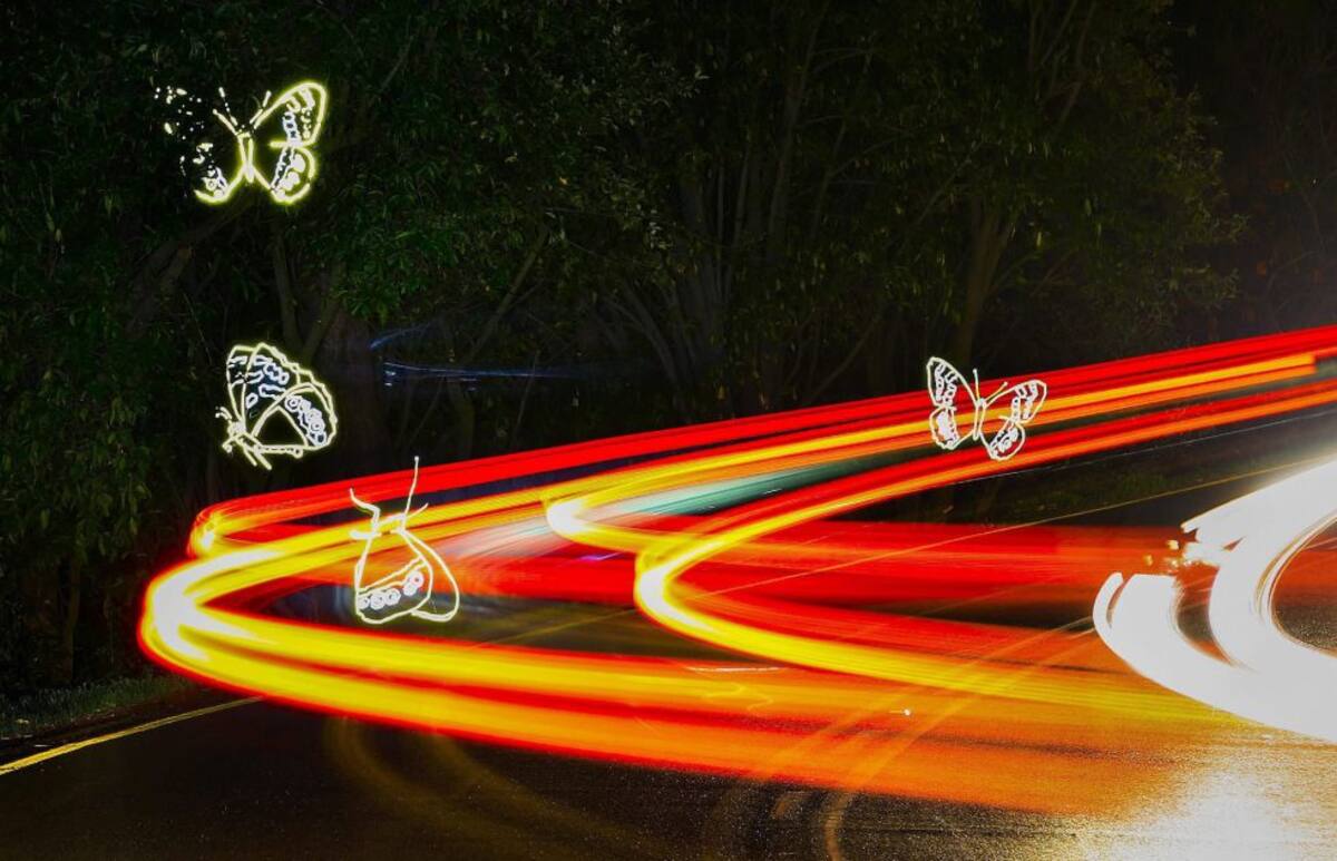 Imagen tomada con larga exposición del paso de varios vehículos junto a una instalación que forma parte del proyecto artístico "The Endemic Project", creado por el artista y realizador sudafricano Bryan Little, en Ciudad del Cabo (Sudáfrica) en la noche d