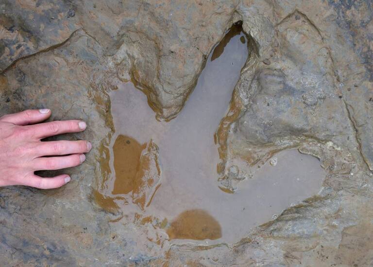 Fotografía de lo que se cree, es una huella de dinosaurio de unos 135 o 145 millones de años en Münchehagen en Hannover (Alemania). Las huellas tienen un diámetro de 1,20 metros.