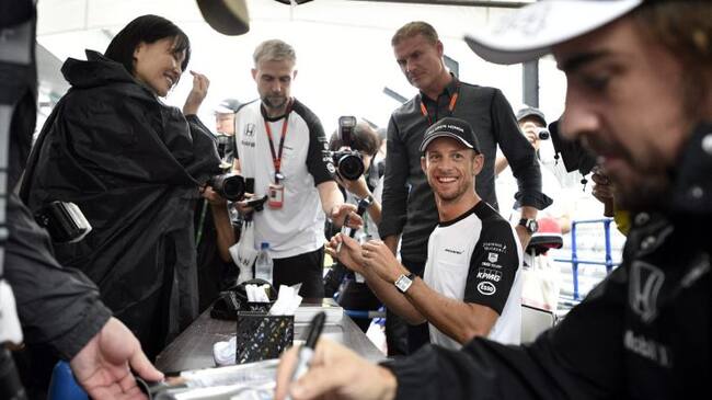 Jenson Button y Fernando Alonso firman autógrafos en Suzuka. / FRANCK ROBICHON (EFE)