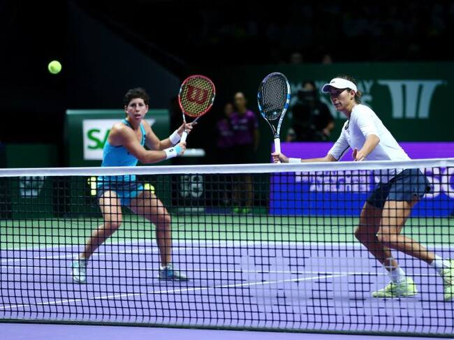 Carla Suarez Navarro y Garbiñe Muguruza se preparan para volear en la red. / Clive Brunskill (Getty Images)