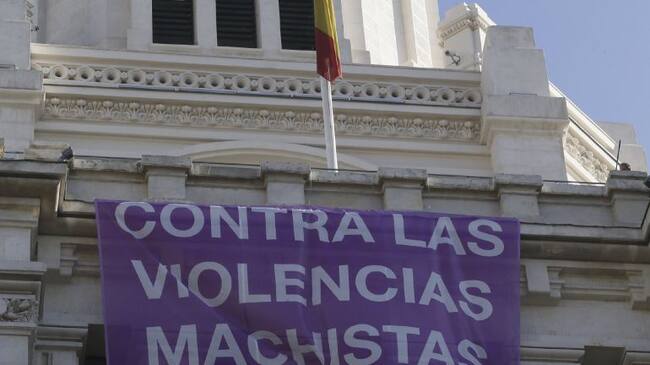 Una pancarta contra la violencia machista en la fachada del Ayuntamiento de Madrid. / Fernando Alvarado (EFE)