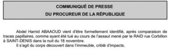 El comunicado de la Fiscalía francesa concreta que el de Abaaoud era uno de los cuerpos “acribillado de impactos de bala”que encontró las fuerzas especiales en el domicilio de la calle Corbillon de Saint-Denis pero que, dada la violencia del asalto, "se ignora por el momento si Abaaoud se hizo, o no, explotar". Además, el fiscal Molins reconocía este miércoles que, dado el estado en que quedó el inmueble tras la explosión, no se descarta que entre los escombros puedan aparecer más muertos.