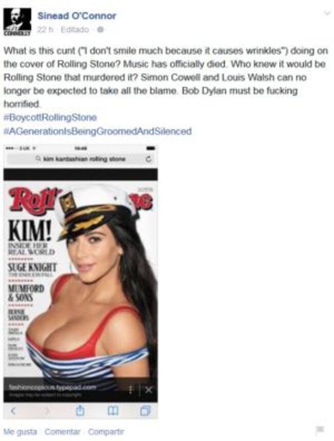 A Sinéad O'Connor no le hizo mucha gracia que Kim Kardashian y su generoso escote protagonizaran la portada de la revista Rolling Stone. "La música ha muerto, quién iba a pensar que sería Rolling Stone quien la mataría?", se preguntaba la cantante irlandesa en las redes sociales.