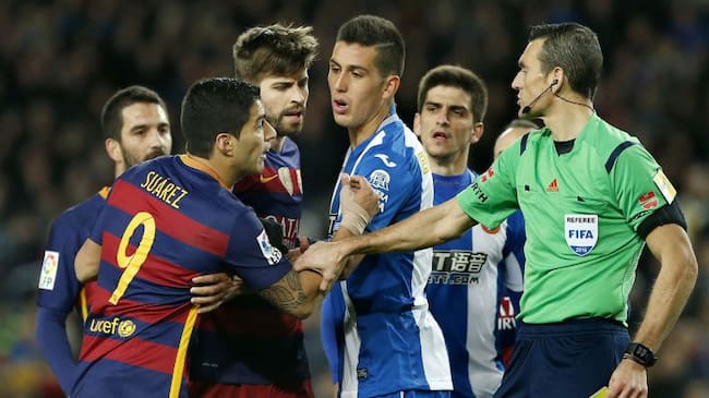 "Al finalizar el encuentro y una vez en el túnel de vestuarios, el dorsal nº 9 del FC Barcelona D. Luis Alberto Suárez Díaz, mientras todos los jugadores del RCD Espanyol subían las escaleras del túnel de vestuarios, les esperó y se dirigió a ellos repitiendo en varias ocasiones lo siguiente: 'Aquí os estoy esperando, venid acá; Sos un desecho'", se recogía en el acta del colegiado Juan Martínez Munuera.