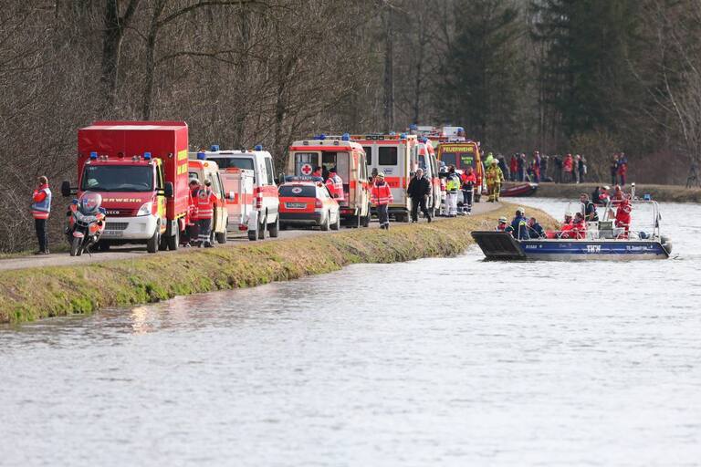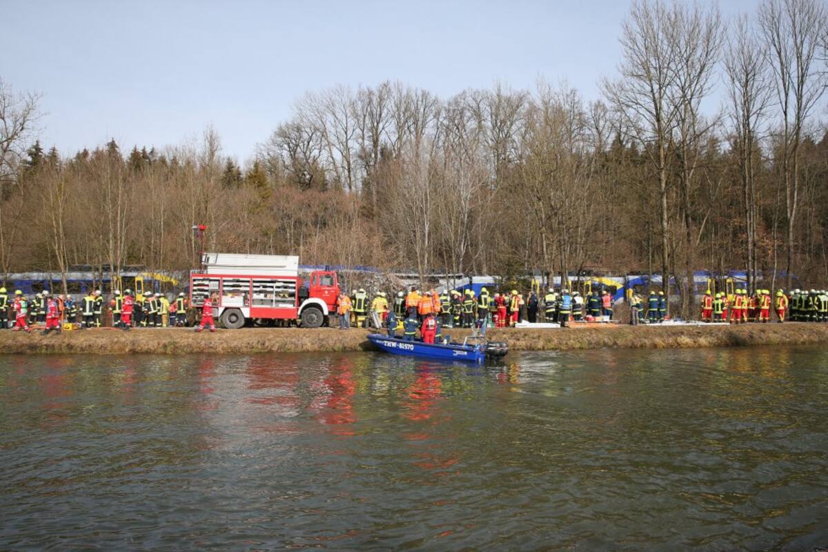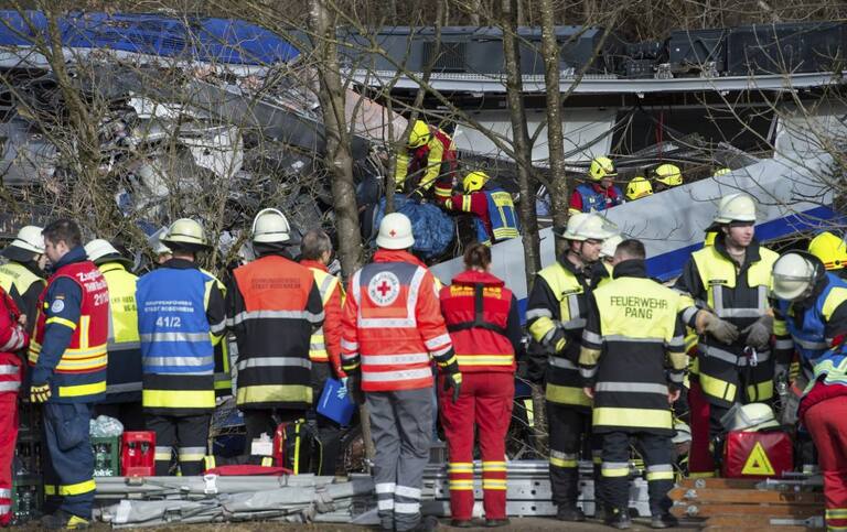 Bomberos trabajan en el lugar donde se ha producido el choque de dos trenes en Bad Aibling.