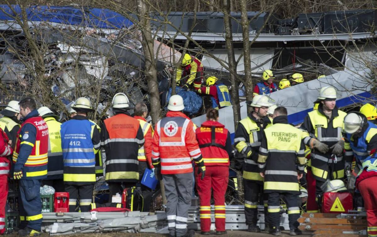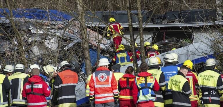Bomberos y miembros de los servicios de emergencia trabajan en el lugar donde se ha producido el choque de dos trenes en Bad Aibling (Alemania).