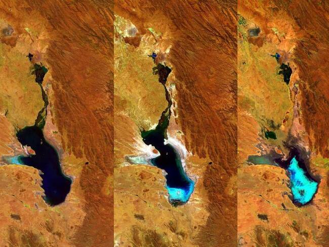 Las tres fotografías muestran la reducción paulatina de la masa de agua, con una profundidad de solo 3 metros. Esa circunstancia, unida al entorno árido montañoso, provocaban que fuese "muy sensible a las fluctuaciones del clima".