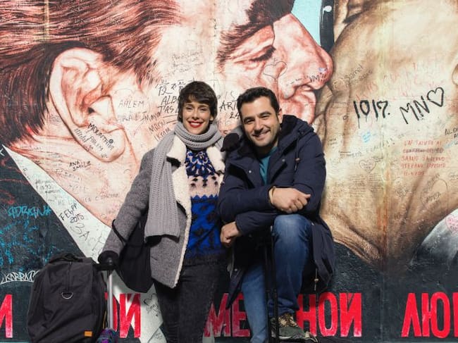 Belén Cuesta y Antonio Velázquez frente a una de las pintadas más famosas del muro de Berlín / ATRESMEDIA