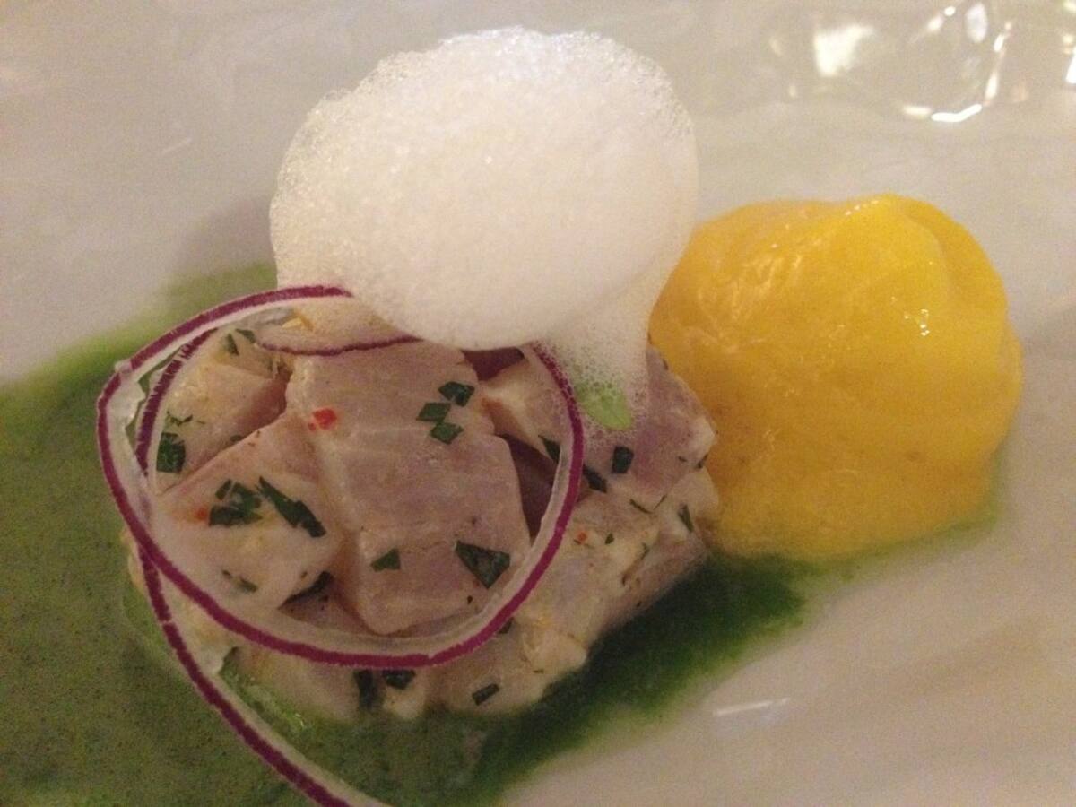 El ceviche de robalo con espuma de mango de Motril (22 euros) forma parte de la carta y de los menús degustación del restaurante El Claustro.