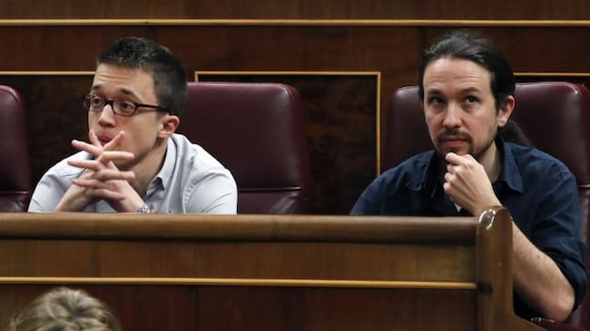 El líder de Podemos, Pablo Iglesias (d), y el portavoz parlamentario del partido, Íñigo Errejón (i), en sus escaños durante la primera jornada de la sesión de su investidura / Javier Lizón (EFE)