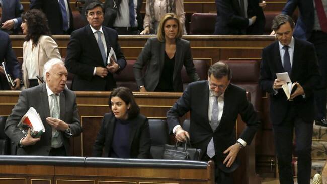 El presidente del Gobierno en funciones, Mariano Rajoy, abandona el hemiciclo junto a sus compañeros de partido / J. J. Guillén (EFE)