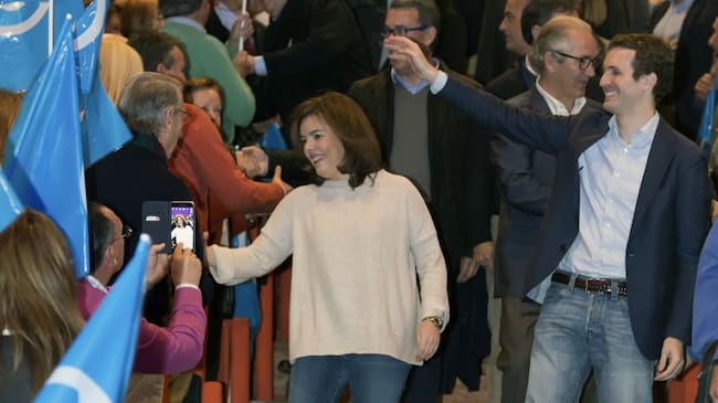 La vicepresidenta del Gobierno, Soraya Sáenz de Santamaría, y el vicesecretario de Comunicación, Pablo Casado, en un acto de campaña / EFE/Raúl Sanchidrián