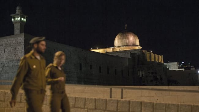 Soldados israelíes caminan junto a la mezquita de Al Aqsa, durante un acto del Muro Occidental de la ciudad antigua de Jerusalén. / Atef Safadi (EFE)