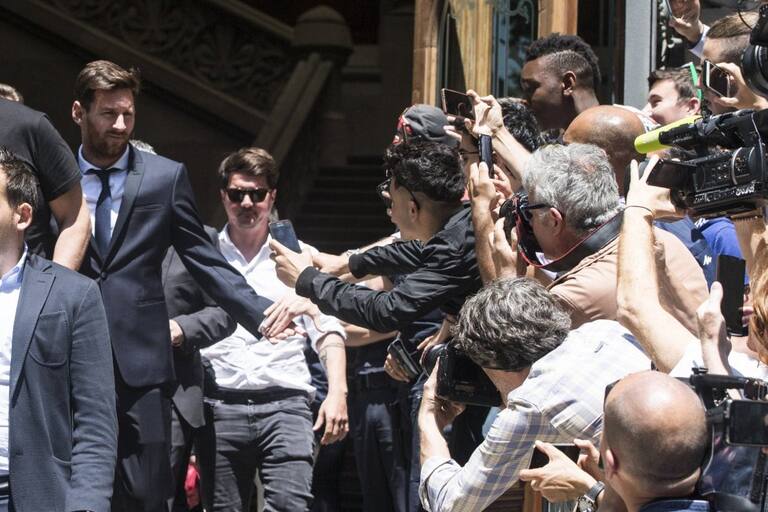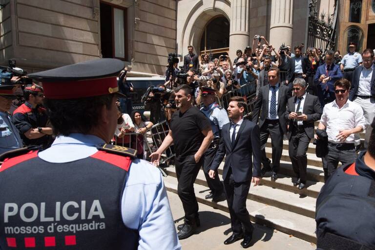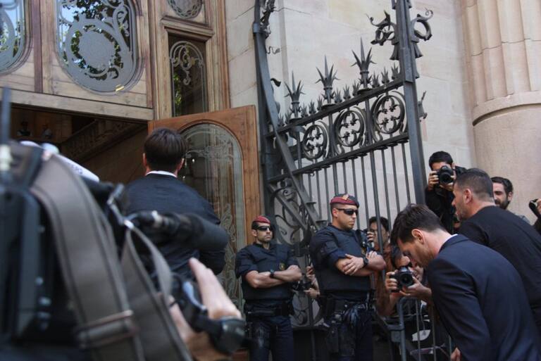 Rodeado de medios de comunicación, el jugador del FC Barcelona abandona el juzgado junto a su padre Horacio Messi y su hermano Rodrigo Messi.